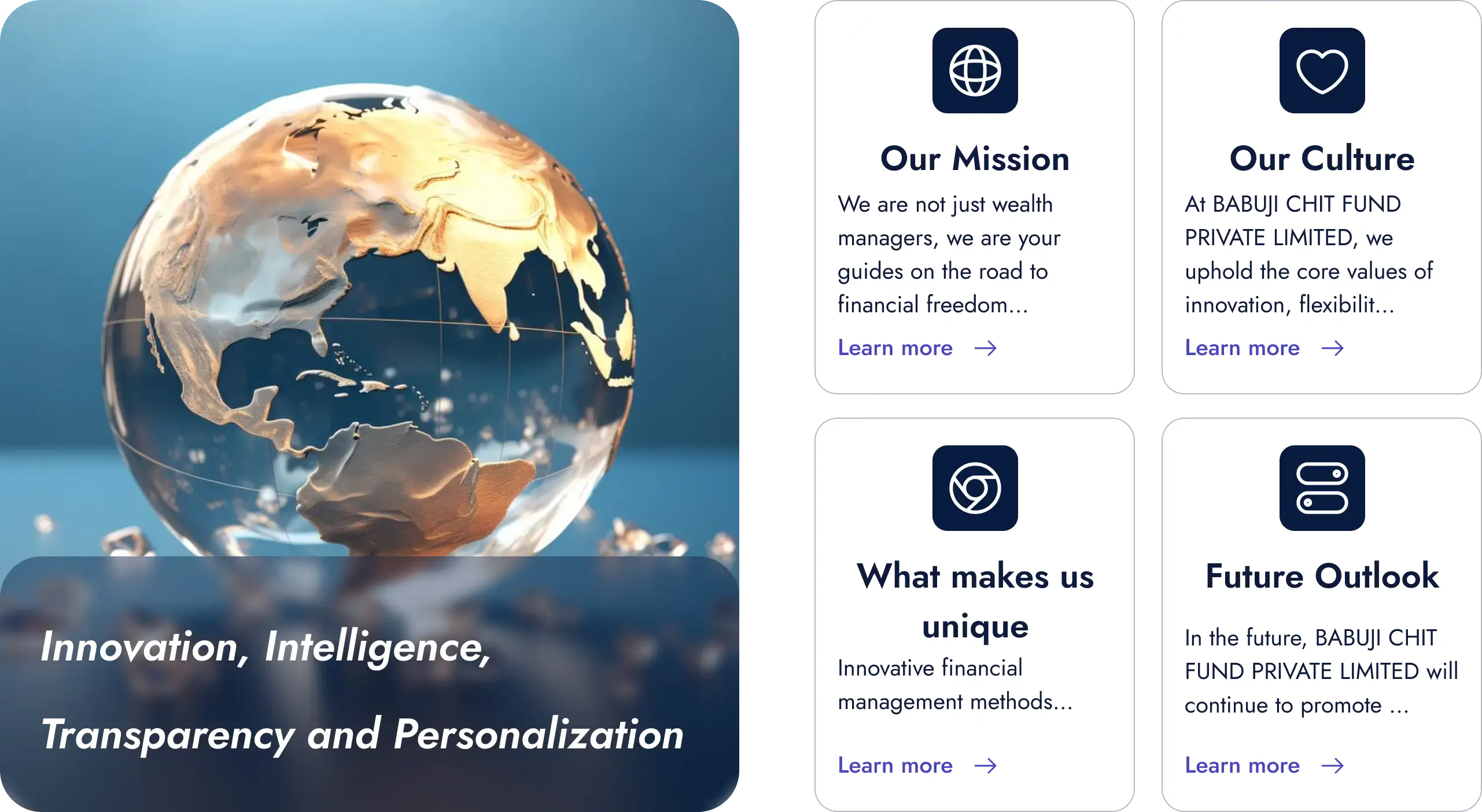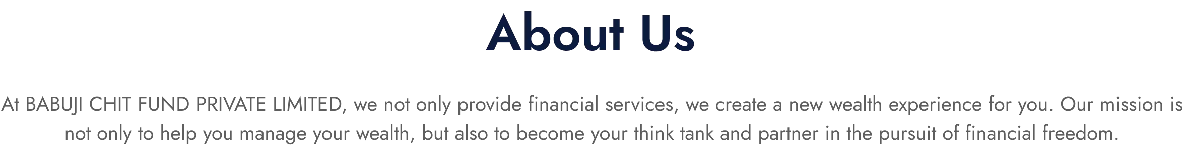 BABUJI CHIT FUND PRIVATE LIMITED is not only a financial management company, but also your "wealth advisor partner", committed to helping every customer achieve more flexible and free wealth management and life planning through innovative financial concepts, transparent investment strategies and intelligent services.